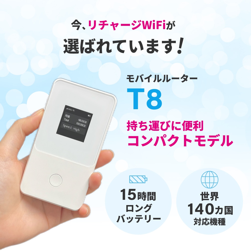 【T8シルバー】リチャージWiFi 100ギガ/365日+世界3ギガ付き ONEワールドモデル